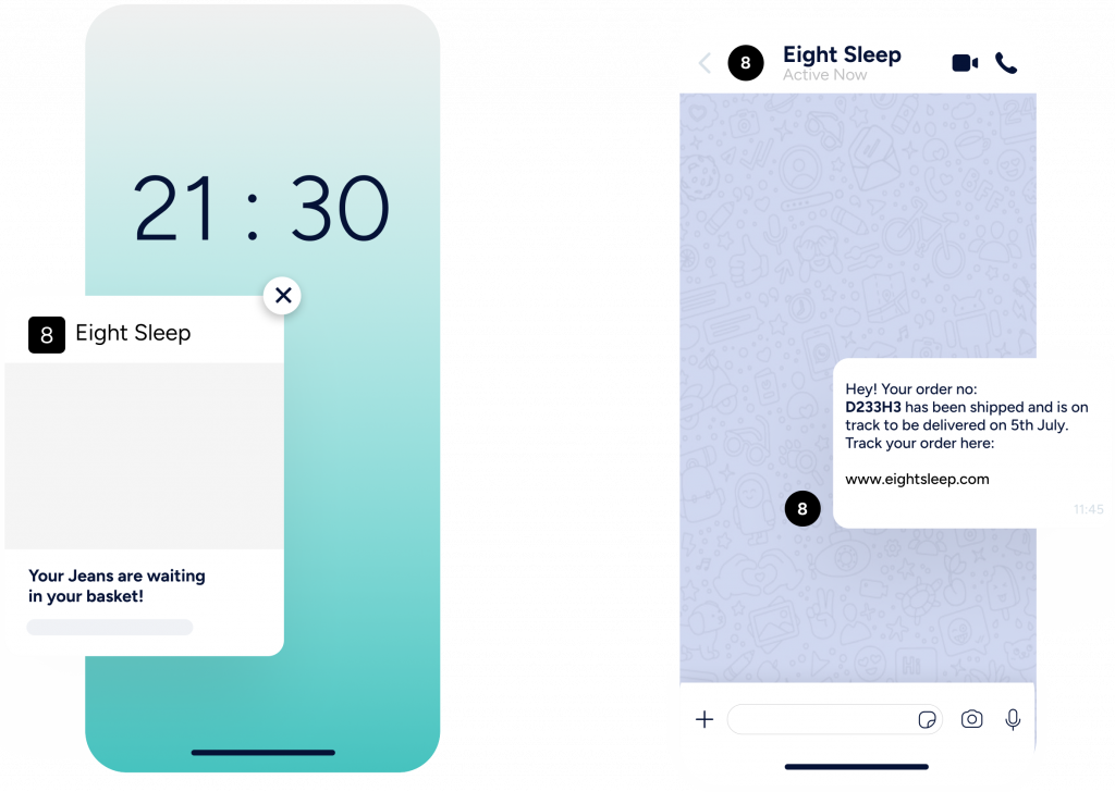 Utilize web push notifications, app push, WhatsApp, Facebook Messenger, Email, SMS and RCS.