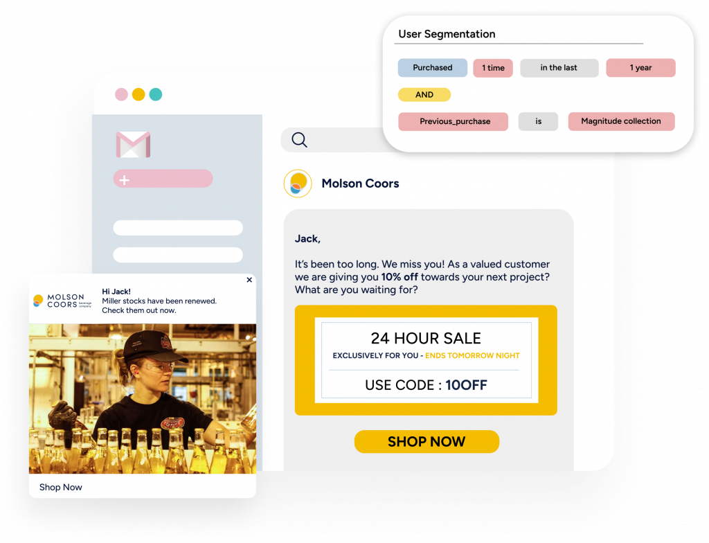 Utilize web push notifications, app push, WhatsApp, Facebook Messenger, Email, SMS and RCS.