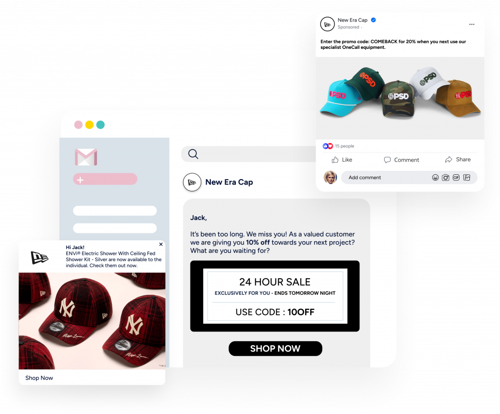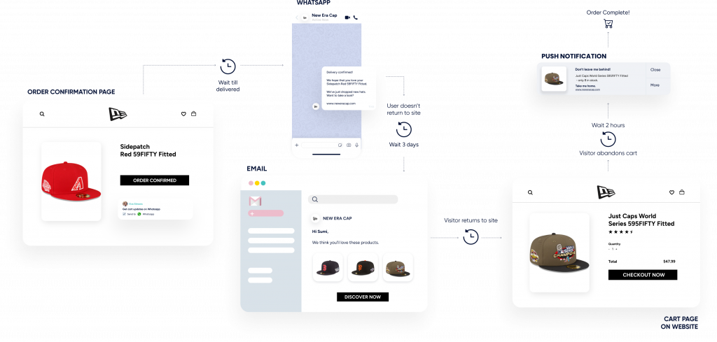 Use Web Push Notifications, WhatsApp, Facebook Messenger, email, and SMS. Send automatic alerts and personalised messages from abandoned cart reminders to back-in-stock reminders to accelerate buying decisions and recover lost sales.