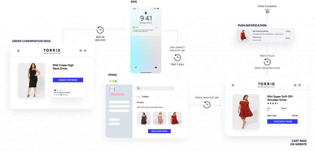 Utilize web push notifications, app push, WhatsApp, Facebook Messenger, Email, SMS and RCS.