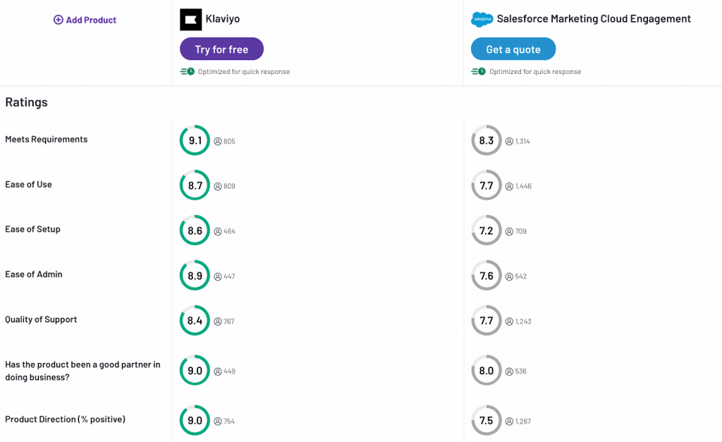 That’s why there’s an entire ecosystem of agencies and consultants built around Salesforce. Organizations must often use their services to set up and manage Salesforce products, which adds another layer of complexity.The platform’s breadth of features and the necessity to use system integrators are the reasons why Klaviyo ranks higher categories like ease of setup, use, and admin.