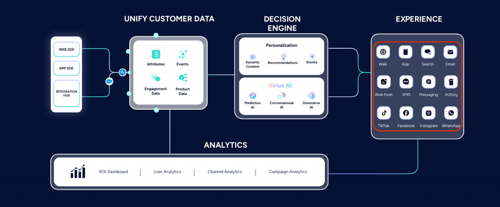 Insider One, on the other hand, brings together 12+ channels under one roof — including web, mobile, email, push notifications, SMS, WhatsApp, Facebook Messenger, social media and search ads, and others.