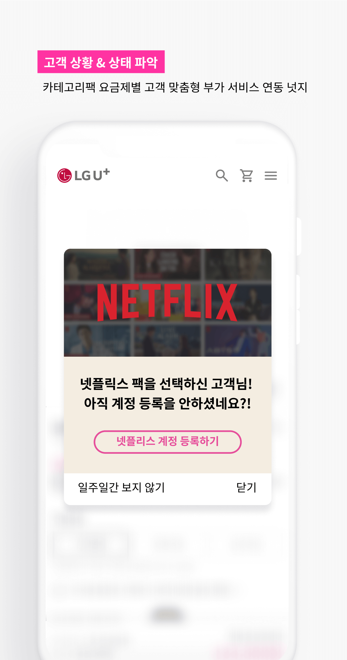 LG유플러스는 휴대폰·요금제 뿐만 아니라 인터넷·IPTV 등 많은 부가 서비스를 제공하고 있어 각 서비스 이용을 활성화시키고자 하는 목표가 있었습니다. 이를 위해 넷플릭스나 디즈니플러스를 추가 요금없이 시청할 수 있는 카테고리팩 요금제에 가입했지만, 아직 각 서비스 계정을 연동하지 않은 고객을 대상으로 인사이더 웹 스위트(Web suite)를 활용한 계정 연동 안내 팝업 캠페인을 진행했습니다. 고객이 인사이더의 팝업 캠페인을 클릭할 경우 계정 연동이 가능한 페이지로 바로 랜딩시켜 고객 접근성과 편의성을 높였습니다. 이는 부가 서비스로 제공되는 콘텐츠를 고객이 보다 쉽고 활발히 소비할 수 있게 하는데 도움이 되었으며, 자사 서비스에 대한 인게이지먼트를 높이는데 긍정적인 효과를 주었습니다.