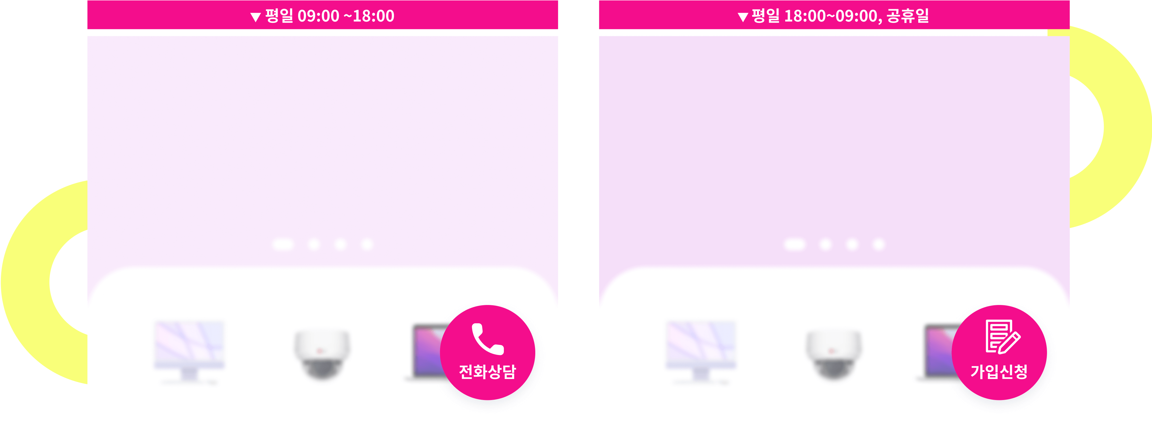 소상공인 전용몰은 기업 전용 서비스를 담당하는 만큼 잠재 리드의 누수와 이탈을 막기 위한 인사이더 캠페인을 진행했습니다. 먼저 전화 상담이 운영되지 않는 평일 저녁 6시 이후 또는 주말 동안 유입하는 유저를 대상으로 ‘전화 상담’ 버튼을 ‘가입 상담 신청’ 버튼으로 변경하고, 클릭시 전화 상담을 예약 할 수 있는 ‘상담 신청 팝업’이 노출 되도록 설정해 유저의 상담 신청 편의성을 확대했습니다.