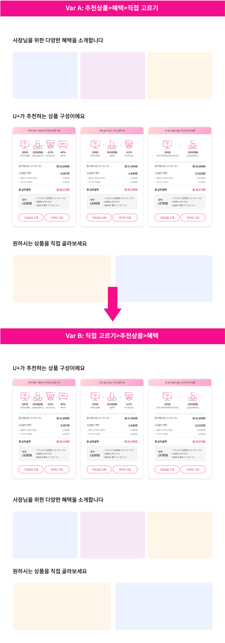 LG유플러스 소상공인 전용몰의 목표는 온라인 주요 채널인 홈페이지를 통해 고품질 B2B 리드 수집을 극대화하는 것이었습니다. 즉, 유효한 기업 고객이 메인 페이지에서 가입 상담 신청 및 전화 상담과 같은 중요한 CTA 영역에 쉽게 접근할 수 있도록 만들어야 했습니다. 소상공인 전용몰은 이를 위해 ‘추천 상품 구성 메뉴‘의 배치 순서 변경을 시도했습니다. 먼저 메인 페이지의 스크롤 뎁스가 낮은 섹션에서 더 많은 액션이 발생할 것이라는 가설을 설정했습니다. 그리고 ‘가입 상담 신청’이나 ‘온라인 즉시 가입’ 등 주요 CTA 영역이 한눈에 보이도록 상단 배치한 버전과 기존 배치를 비교하는 AB 테스트를 약 한 달간 진행했습니다. 그 결과 동일 기간 동안 기존 대비 상담 신청 버튼 클릭률이 최대 21.7% 향상한 것을 확인할 수 있었습니다. 인사이더와 AB테스트를 지속적으로 진행한 소상공인 전용몰은 각종 테스트 결과에 따른 유저 행동 데이터를 누적함으로써 최적의 고객 경험을 구현해 나갈 수 있었습니다.