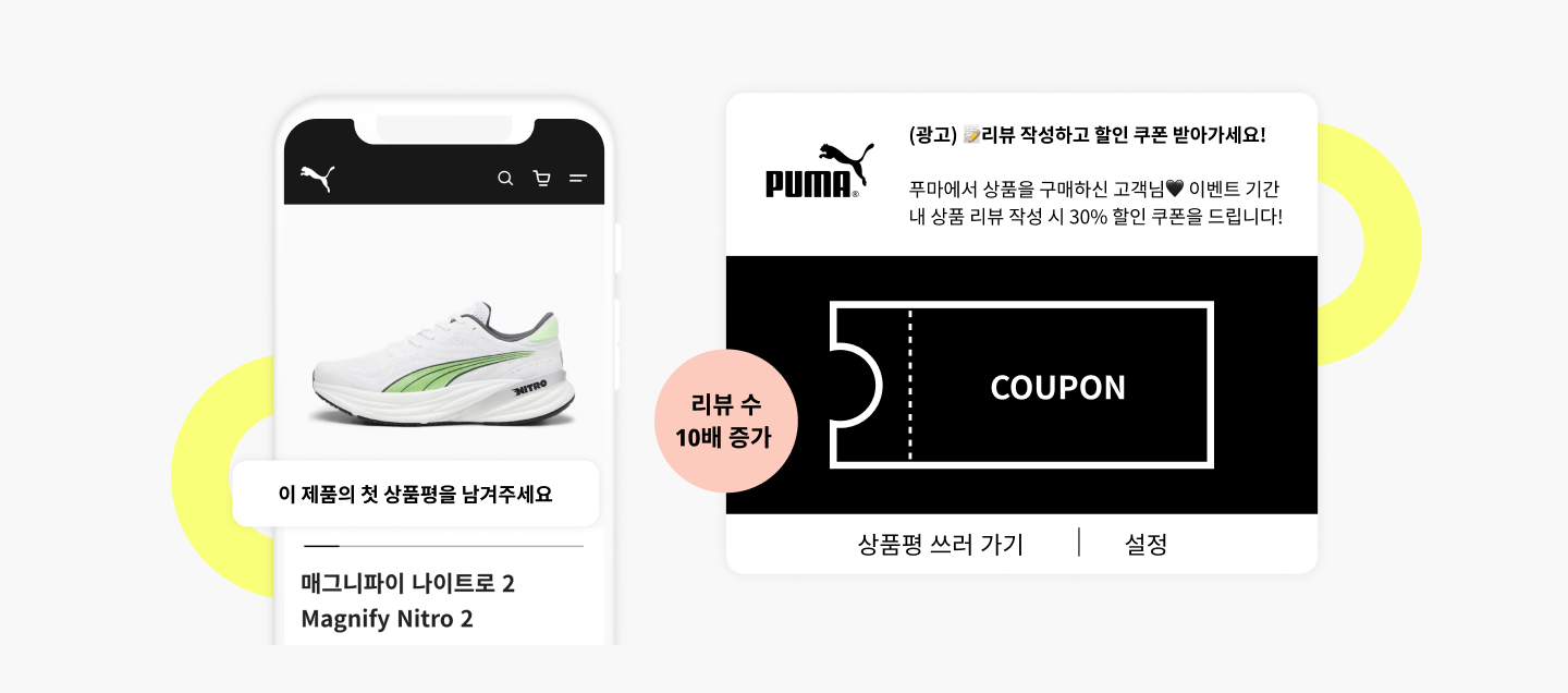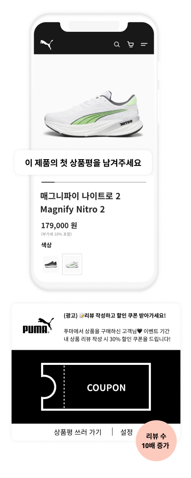 온라인 쇼핑몰에서 소비자의 구매 당락을 결정짓는 가장 중요한 요인은 리뷰입니다. 소비자들은 상품에 대한 정보를 얻기 위해 실구매자 후기에 상당 부분 의존하며, 소비자의 절반 가량이 이를 지인 추천 만큼이나 신뢰합니다. 때문에, 리뷰가 곧 브랜드 경쟁력이라 해도 과언이 아닙니다. 푸마는 자사 이커머스 운영과 오픈 마켓 및 플랫폼 입점을 병행하며 온라인 비즈니스를 적극적으로 확장하고 있습니다. 특히, 새롭게 리뉴얼 오픈한 공식 온라인 스토어의 매출 경쟁력 강화를 위해 양질의 리뷰를 확보하고자 했습니다.