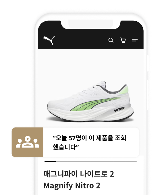 푸마는 인사이더 솔루션을 활용하여 구매를 유도하기 위한 넛지를 배치했습니다. 먼저 상세 페이지에 소셜 프루프 기능을 설정해 잠재 고객에게 다른 사람의 행동 정보를 실시간으로 공유했습니다. 이로써 ‘구매의 타당성’을 강조하고 군중심리로 인한 구매 욕구를 자극했습니다. 이때, 소셜 프루프의 다양한 베리에이션을 노출시켜 보다 현실적인 메시지로 잠재 고객의 신뢰를 강화하고 구매 결정을 촉진할 수 있었습니다.