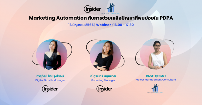 ในวันพฤหัสที่ 16 มิถุนายม เวลา 16.00 – 17.30 น. Insider มีการจัด Panel Discussion พร้อมได้รับเกียรติจาก คุณชเวตา กุกเรยา แขกพิเศษจาก New Era Consulting ผู้เชี่ยวชาญเรื่อง PDPA และผ่านการช่วยบริษัทชั้นนำเตรียมตัวสำหรับการทำ PDPA ในหัวข้อเรื่อง Marketing Automation กับการช่วยเหลือปัญหาที่พบบ่อยใน PDPA โดยความร่วมมือของ Insider และ New Era Consulting มาร่วมแบ่งปัน เกี่ยวกับพรบ. คุ้มครองข้อมูลส่วนบุคคลหรือ PDPA กับการเก็บข้อมูลของลูกค้าอย่างถูกต้อง