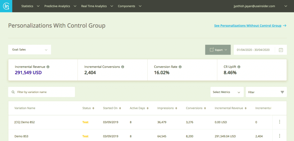 With multiple campaigns running simultaneously, it gets difficult to spot the campaign that might be contributing the most to your hero metrics like incremental revenue, incremental conversion, to name a few. You can filter out or group together a few personalization campaigns to pick the winning combination or single out the winning campaign and focus your efforts on campaigns that would boost your ROI.