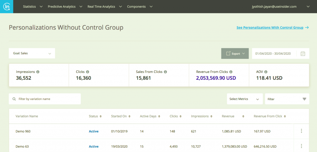 Currently, the dashboard is enabled to track all your web and mobile web personalization campaigns, with or without control groups. The metrics are shown in a much easier format that even external business executives can understand and depend on it for decision-making. The main features of the dashboard are: