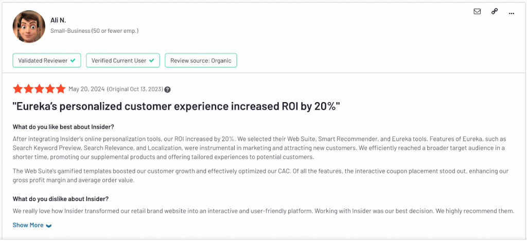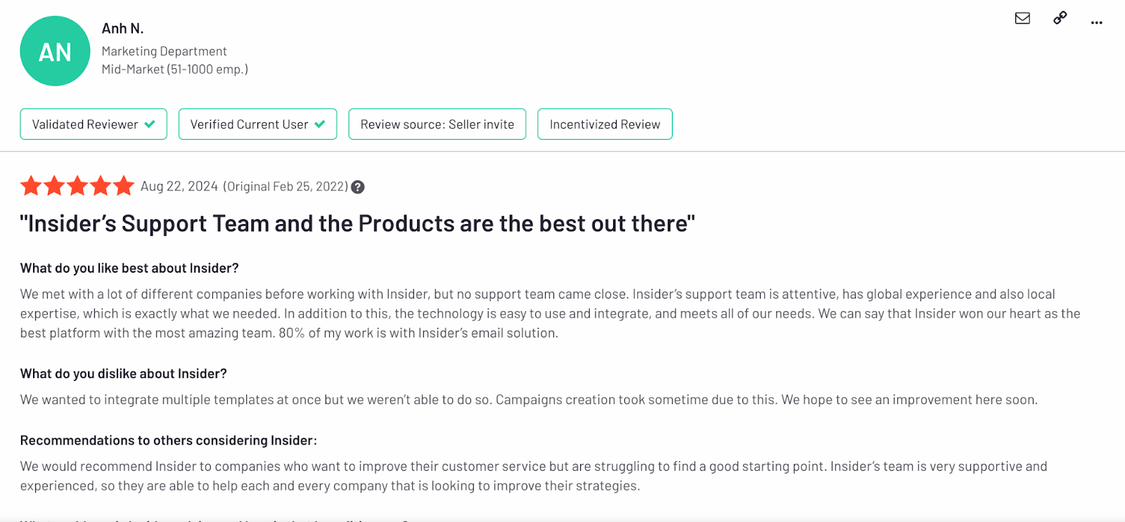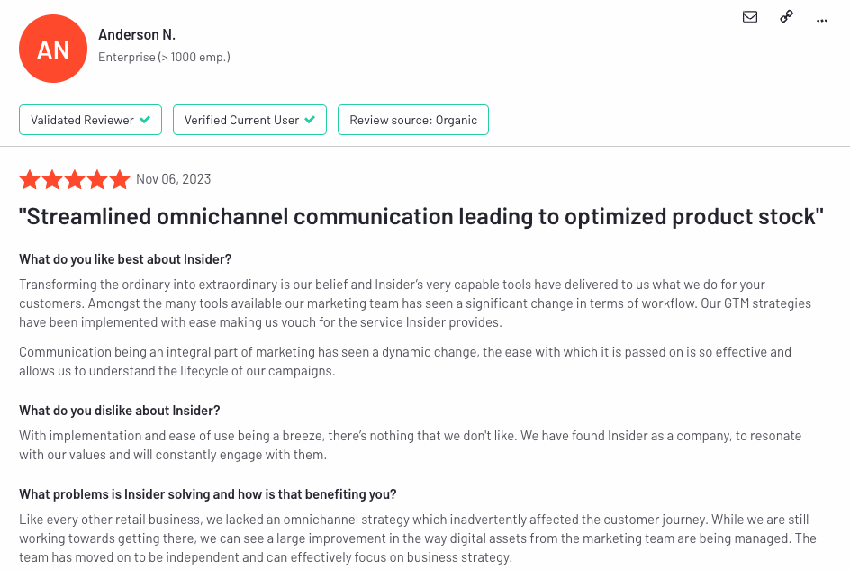 Our customers frequently highlight the difference Insider One makes: “Very fast product with efficient results. We were surprised by how fast and easy the integration process was. Insider One’s team was helpful throughout, leaving no question mark in our minds concerning their tools.”
