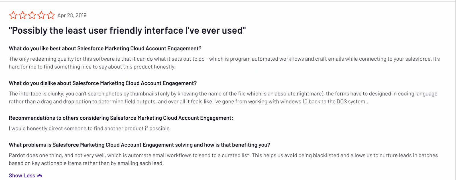These experiences are not isolated. Many marketers find that Salesforce’s complicated interface, lack of customer support, and slow processes lead to clashes between marketing and IT teams, further hindering productivity and progress.