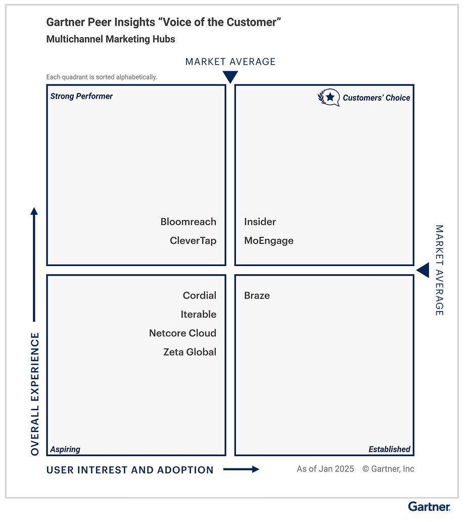 “Our recognition as a Customers’ Choice for Multichannel Marketing Hubs, alongside being named a Leader in the Gartner Magic Quadrant for Personalization for three consecutive years, is a clear reflection of our ongoing commitment to innovation, performance, and customer-centric excellence,” said Hande Cilingir, Co-Founder and CEO at Insider.Our team is committed to delivering the ultimate vendor experience – with better support, account management, and product feedback. We have built a culture centered on customer obsession and embracing customer problems. Insider One’s award-winning customer service and onboarding approach blends its leading product with superior support from local industry experts. New customers can expect migration to be completed quickly with zero downtime and the fastest Time To Value (TTV), 3X quicker than any other vendor (independently verified by users) to maximize performance against core metrics such as revenue, average order value, and customer lifetime value. Today, Insider One is executing the most ambitious AI and product roadmap in the industry, delivering even greater value to our customers. We’re building this hand-in-hand with them, ensuring every AI capability we develop is designed to solve real challenges and create meaningful impact.”