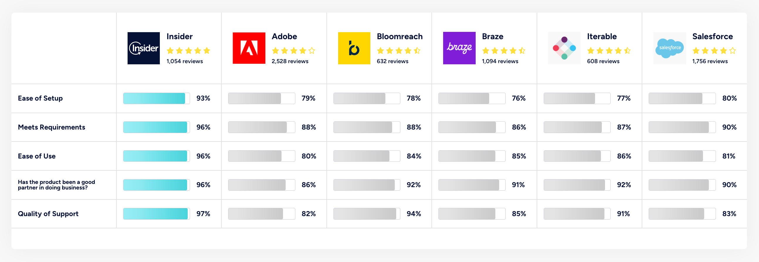 See the full comparison report of Insider One x Adobe x Bloomreach x Braze x Iterable x Salesforce