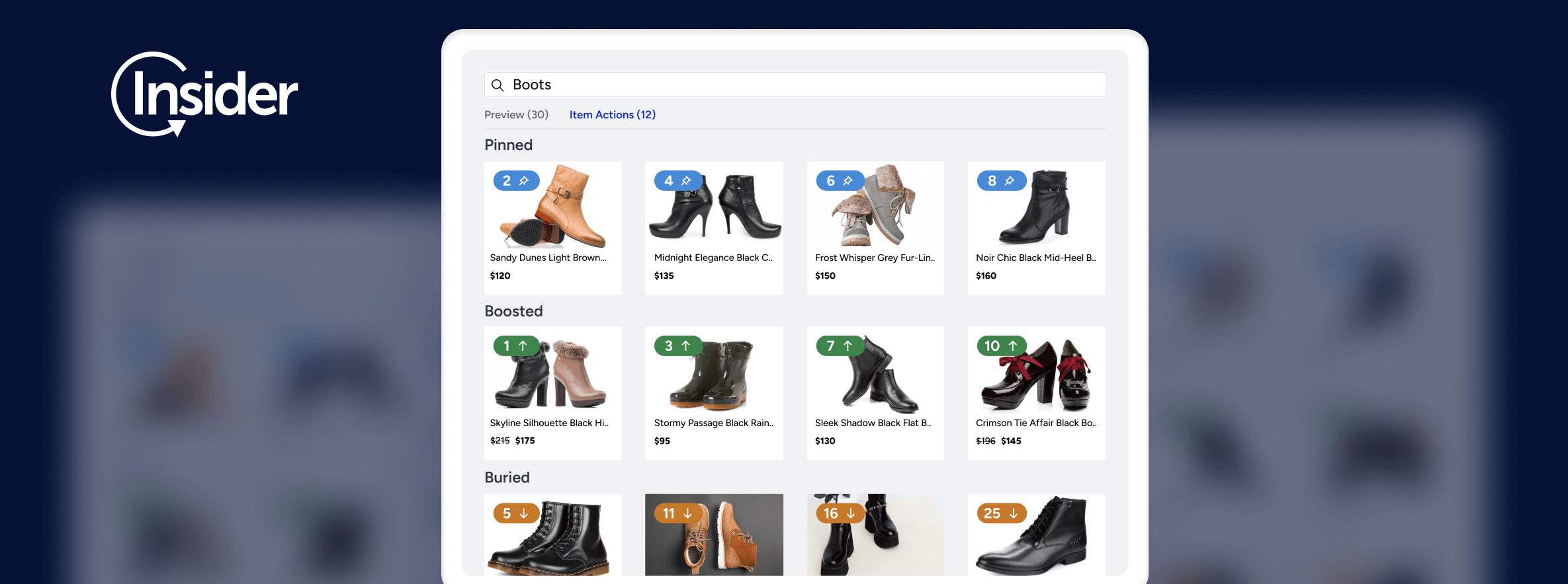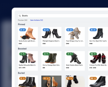 By defining rules to boost or bury products based on product attributes to reflect the business’s merchandising strategy, marketers can further amend the position and ranking of individual products by moving them to a desired position, pinning them, or hiding them.
