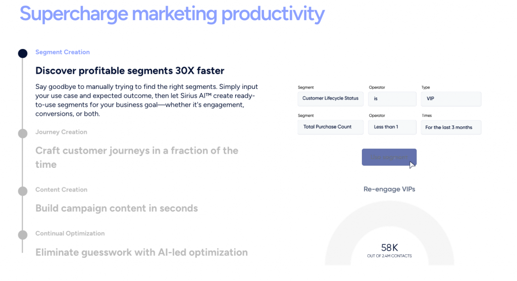 - Sirius AI which can build campaign segments, journeys, text, and images using text prompts. You can provide simple text prompts with your end goal and our Generative AI will do the heavy lifting of creating customer segments, omnichannel journeys, campaign copy, and images in a matter of seconds.
