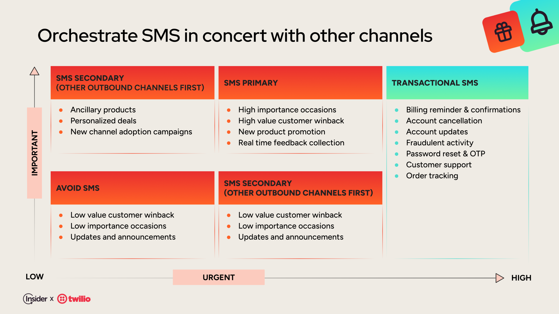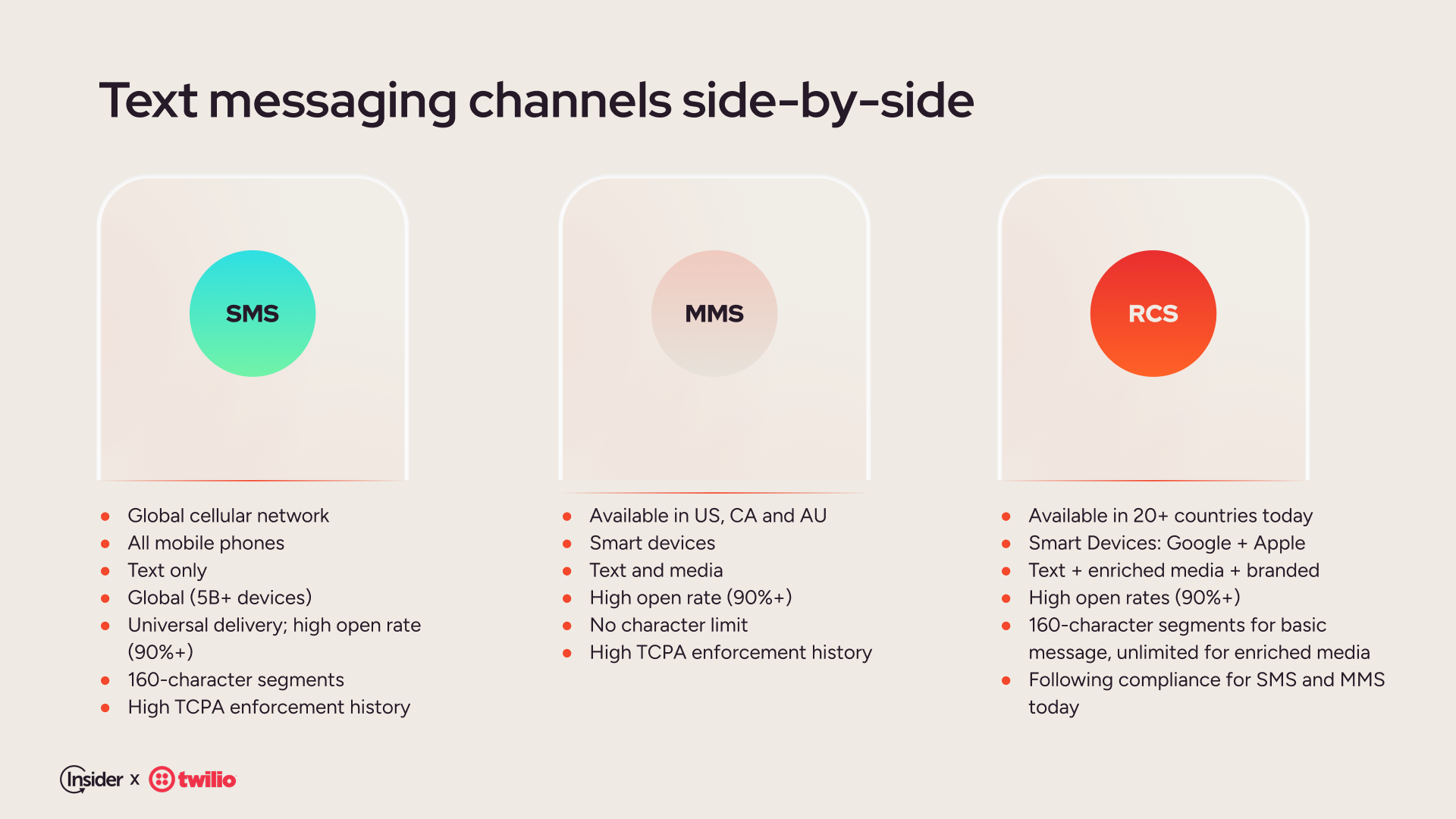 - Diversify your channel mix with old and new options. Pair SMS with email, push notifications, WhatsApp, RCS, and social channels. That way, if one channel is disrupted, your message still lands.