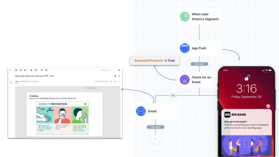 Also use channels like email & messaging apps to continuously relay information about the COVID outbreak, changes in banking regulations from central banks and government advisories that affect banks. This gives your employees and customer service teams the much needed information while they engage with your customers via digital channels. Make use of workflow automation tools like Insider One’s Architect wherever possible to do this efficiently and effectively.