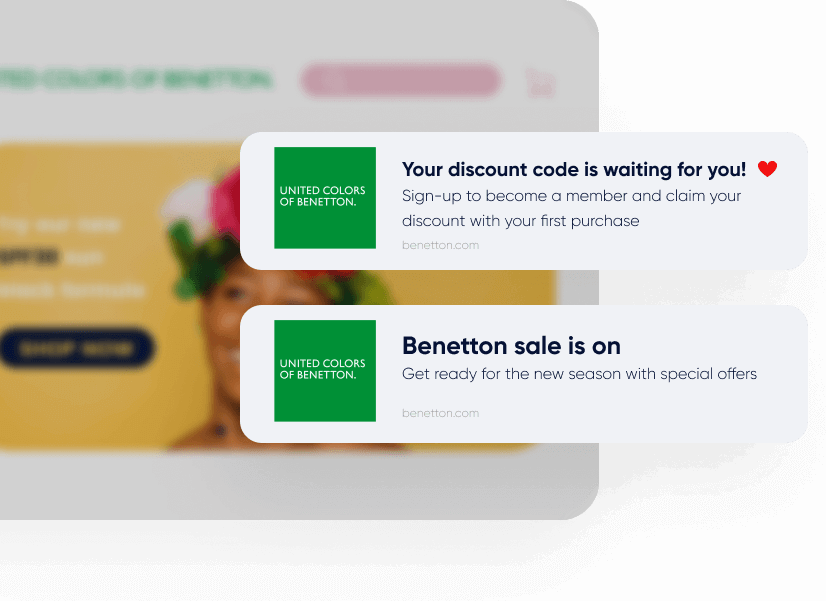 As notificações web push acionadas automaticamente visando novos usuários ajudaram a Benetton a atingir uma taxa de inscrição de novos usuários de 5,7%, que é 9,6 vezes maior do que a taxa média de inscrição no site.