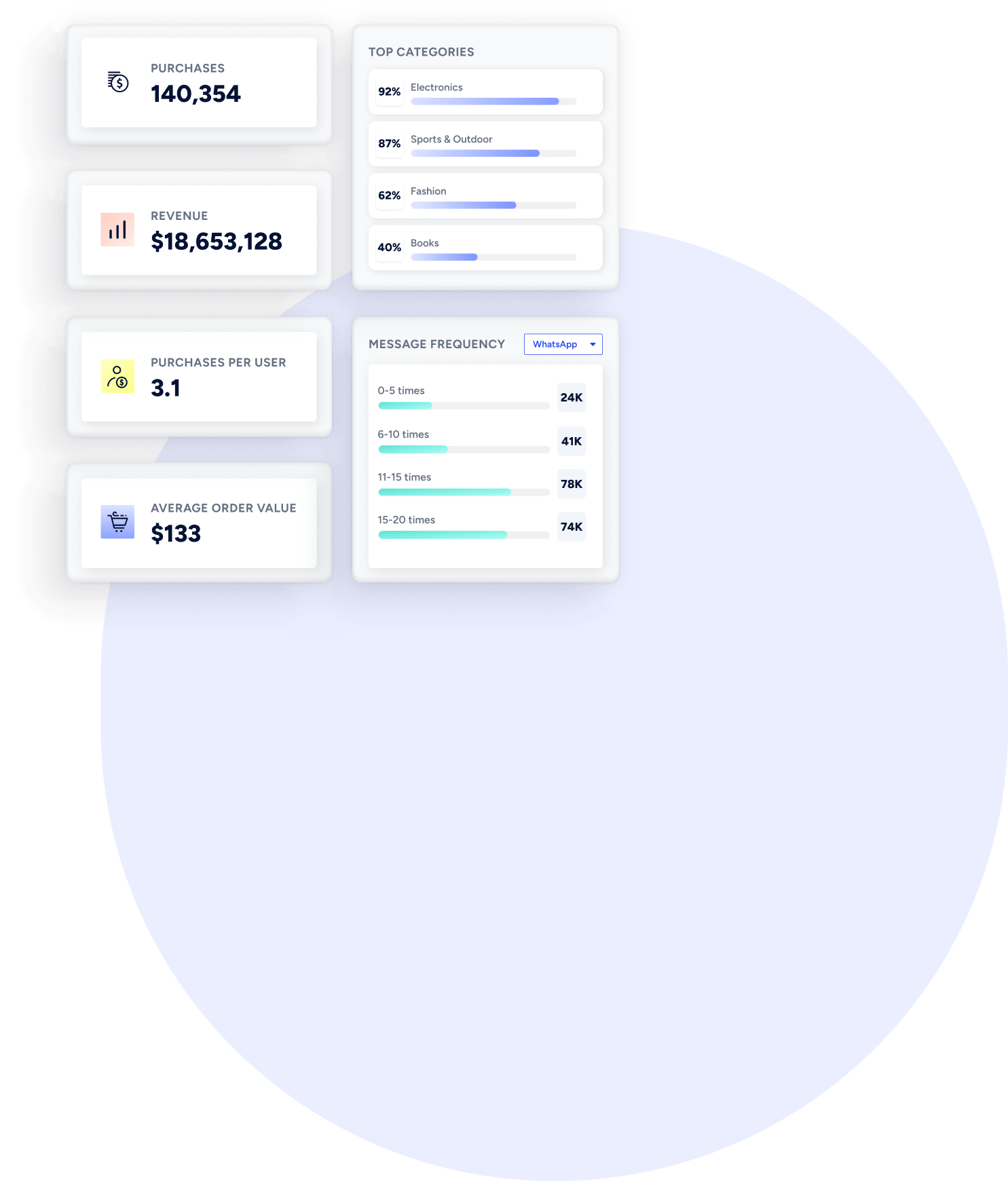 Learn what’s performing - and why - to increase purchases. Discover top purchased categories, time to purchase, and more, and use these insights to build campaigns that increase revenue.