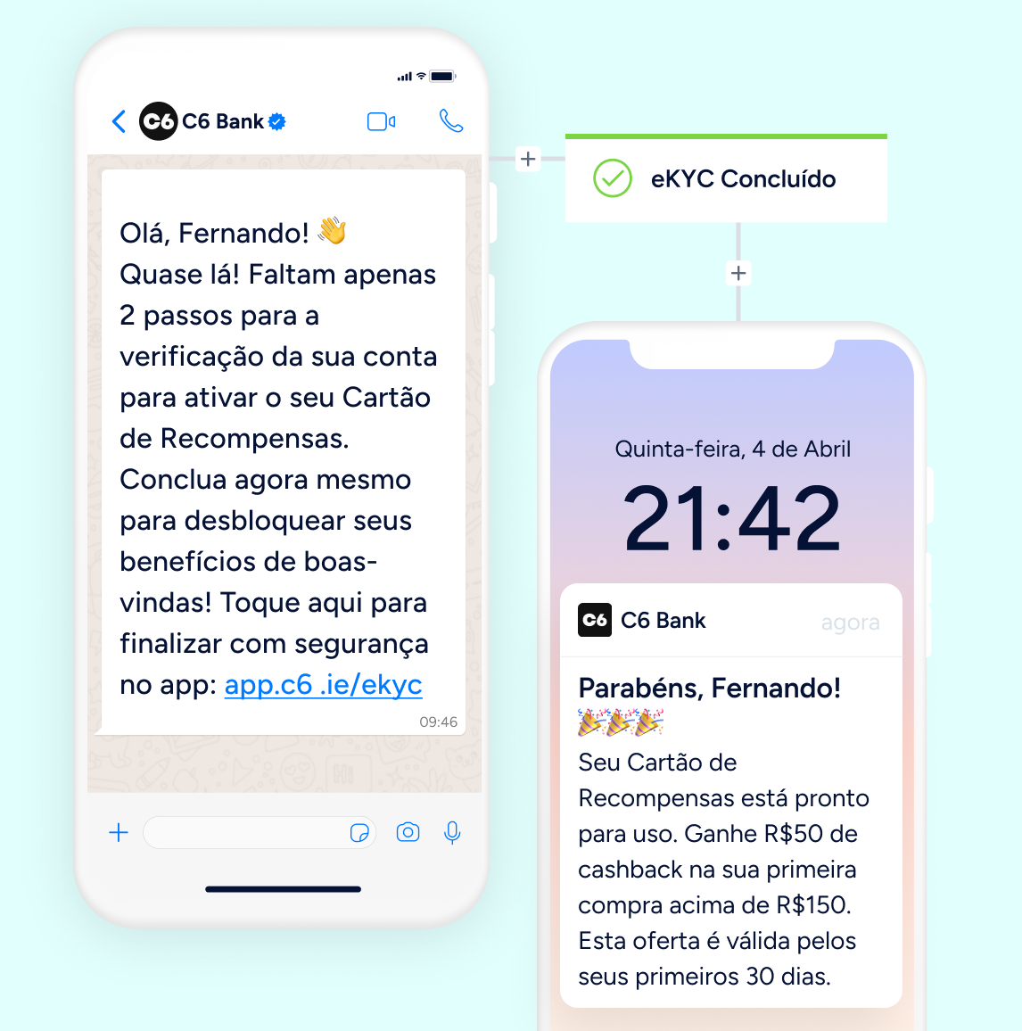 Recupere usuários que abandonam durante o processo de eKYC com lembretes oportunos via WhatsApp e push no app. Em seguida, conduza-os até a primeira transação para concluir o onboarding.