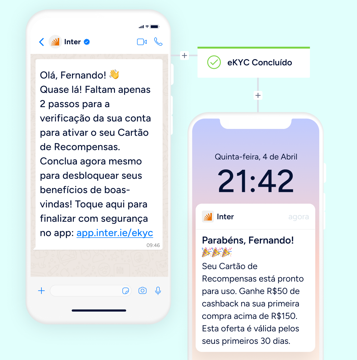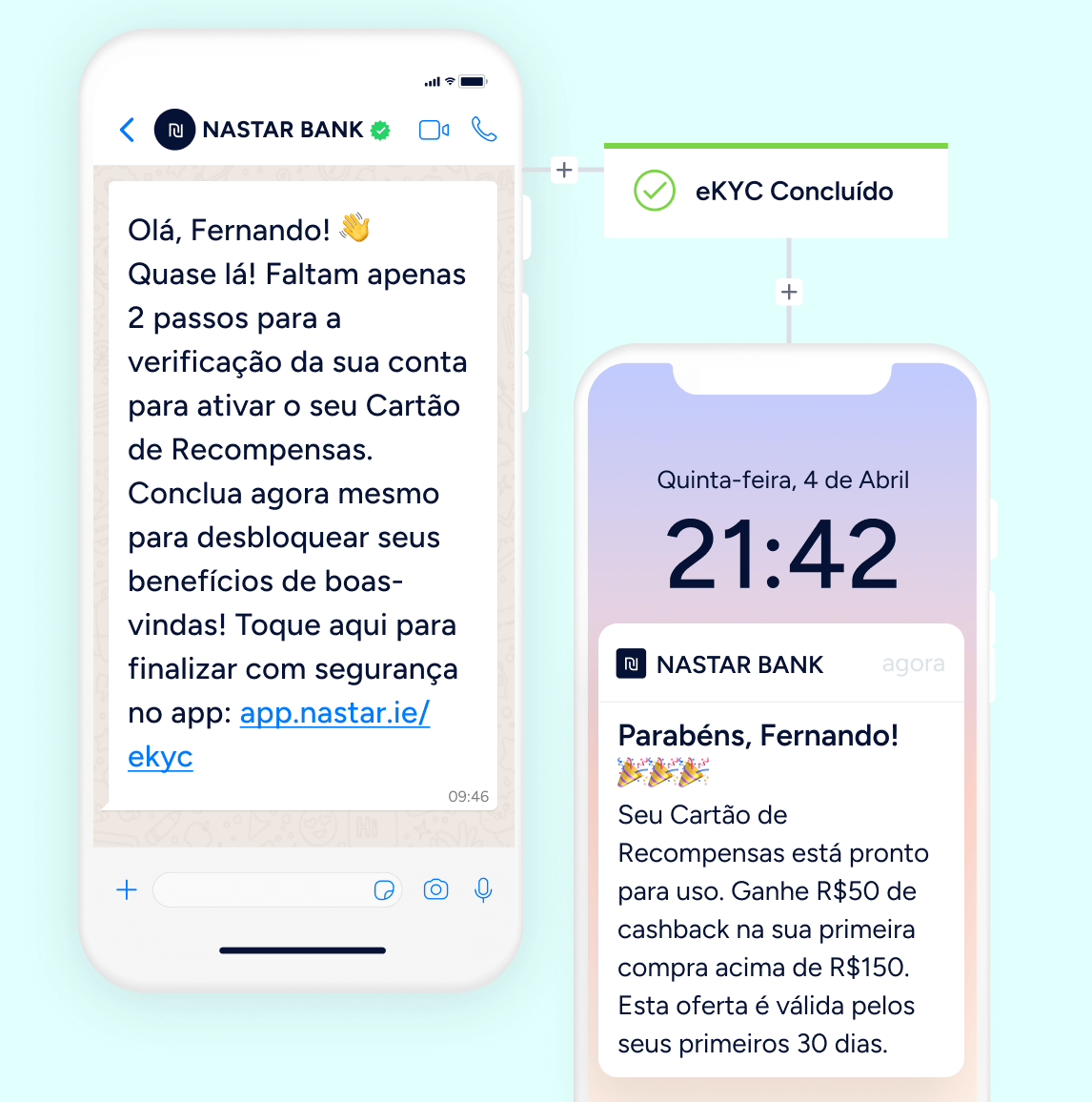 Recupere usuários que abandonam durante o processo de eKYC com lembretes oportunos via WhatsApp e push no app. Em seguida, conduza-os até a primeira transação para concluir o onboarding.