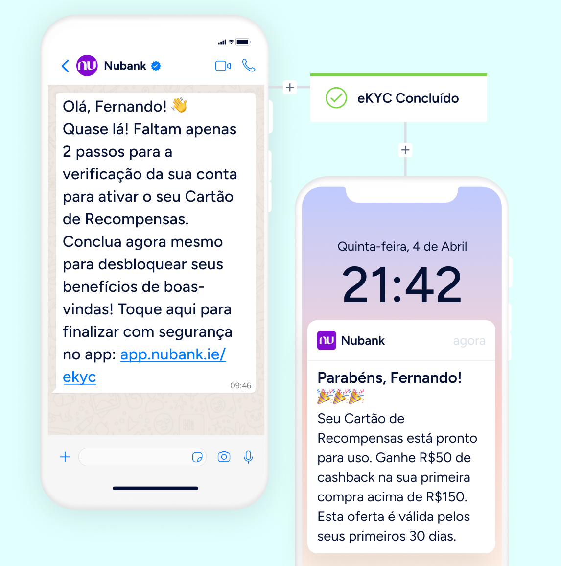 Recupere usuários que abandonam durante o processo de eKYC com lembretes oportunos via WhatsApp e push no app. Em seguida, conduza-os até a primeira transação para concluir o onboarding.