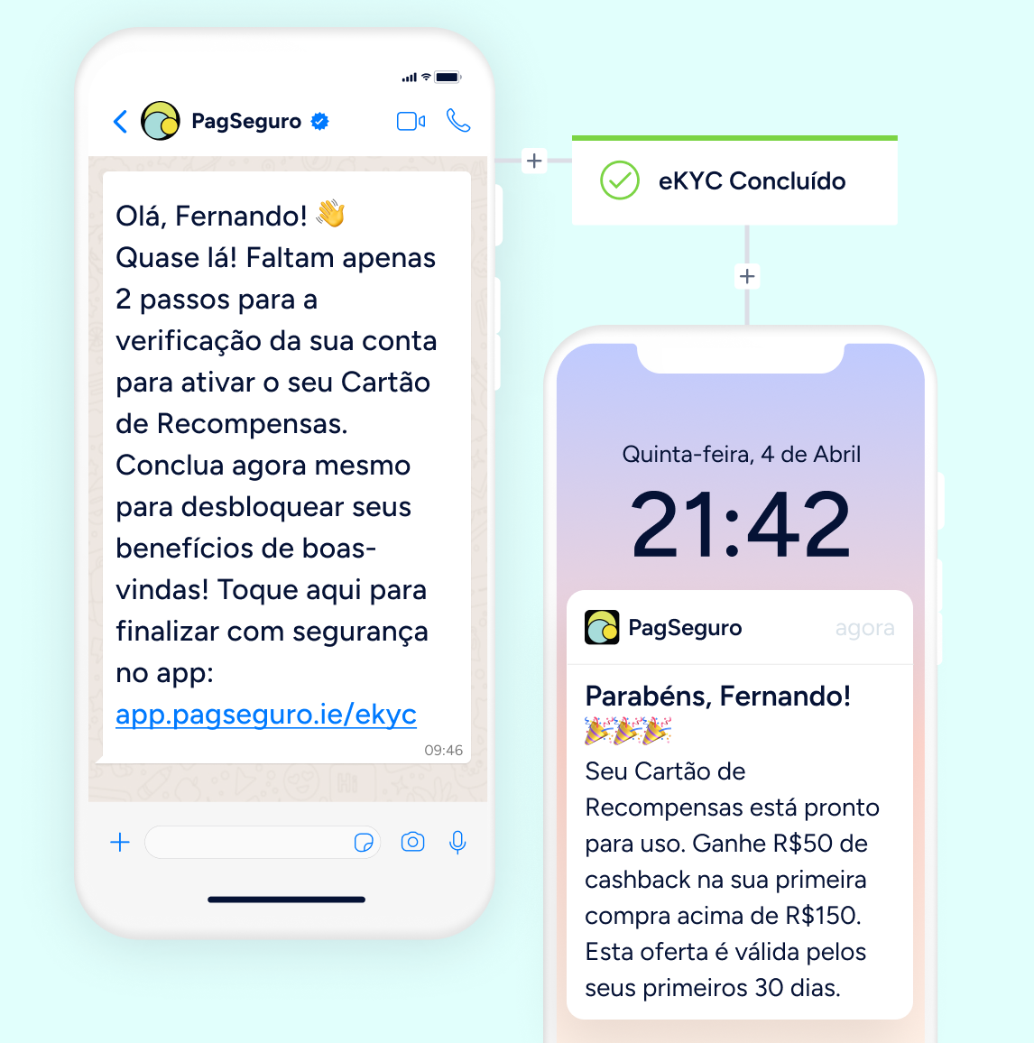 Recupere usuários que abandonam durante o processo de eKYC com lembretes oportunos via WhatsApp e push no app. Em seguida, conduza-os até a primeira transação para concluir o onboarding.