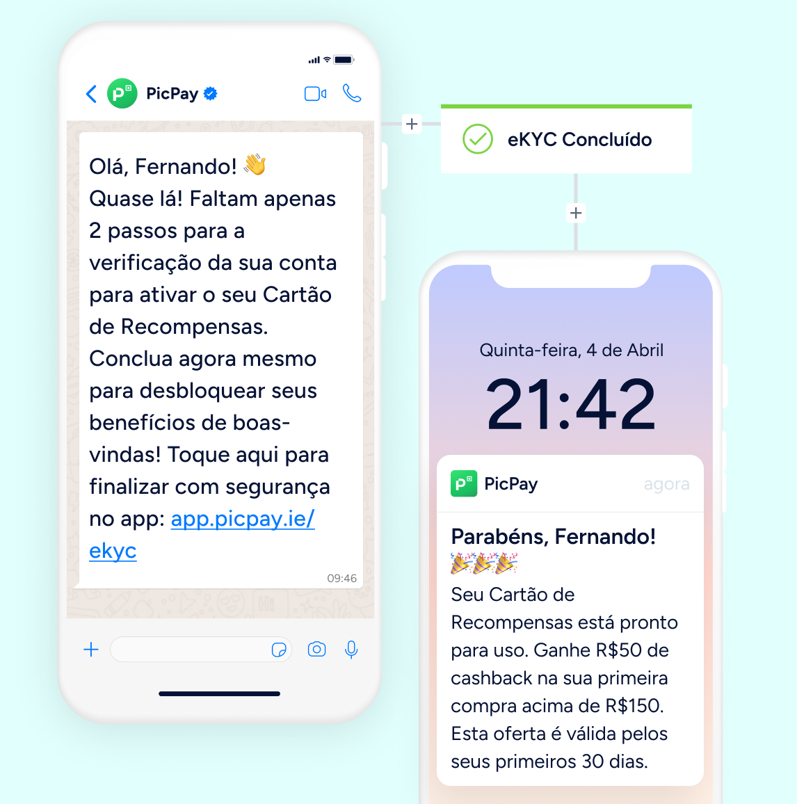 Recupere usuários que abandonam durante o processo de eKYC com lembretes oportunos via WhatsApp e push no app. Em seguida, conduza-os até a primeira transação para concluir o onboarding.