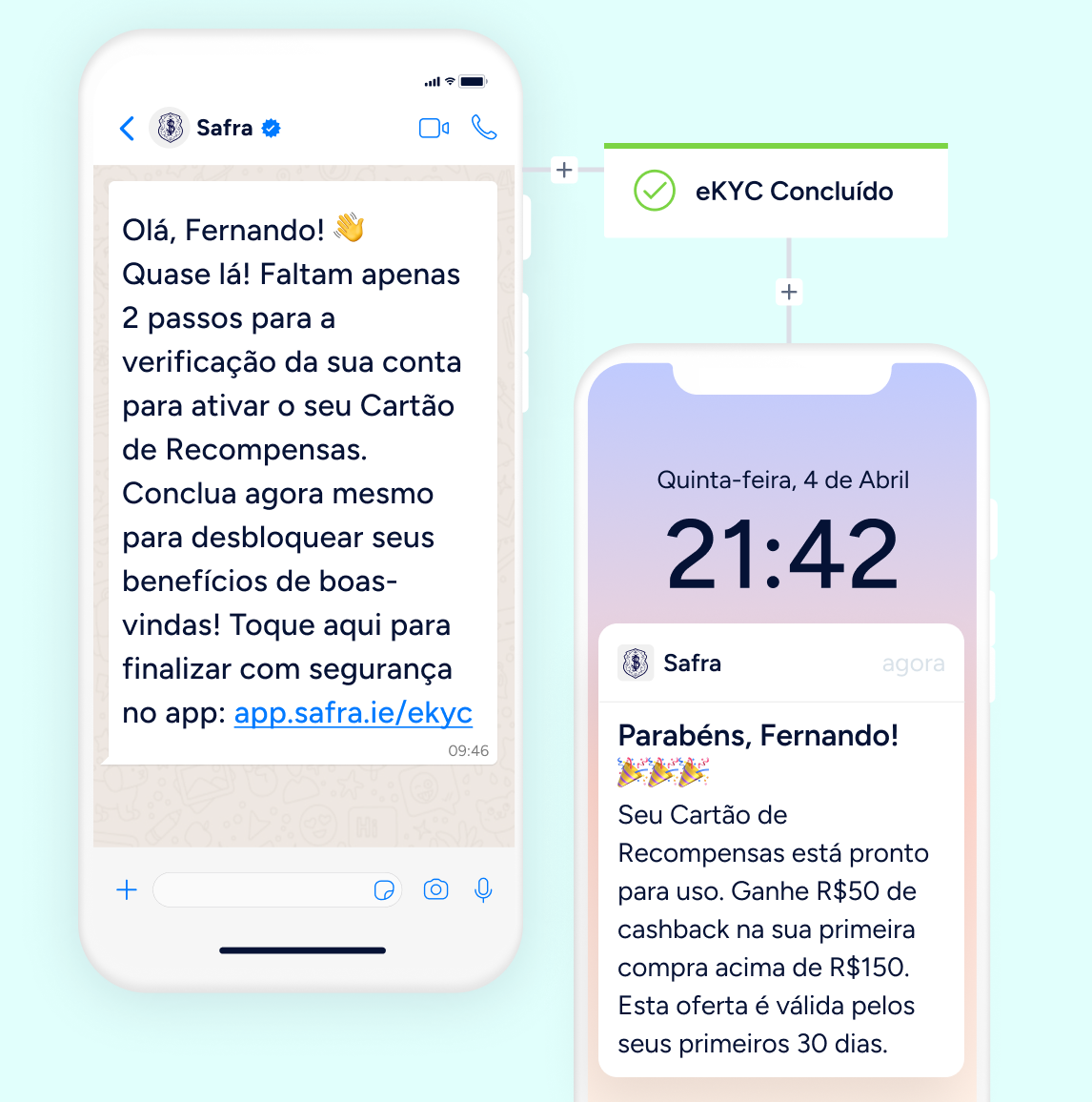 Recupere usuários que abandonam durante o processo de eKYC com lembretes oportunos via WhatsApp e push no app. Em seguida, conduza-os até a primeira transação para concluir o onboarding.