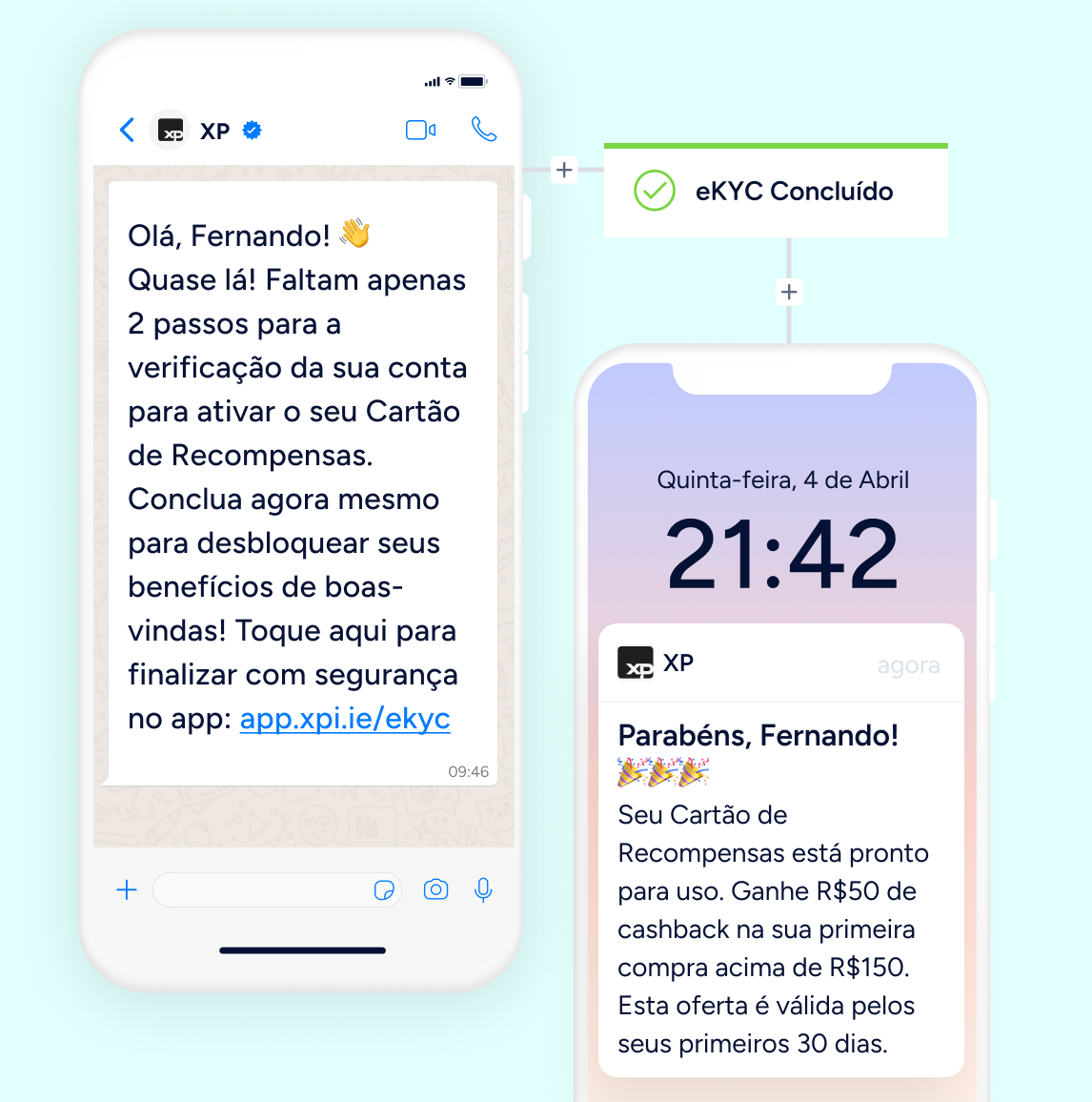 Recupere usuários que abandonam durante o processo de eKYC com lembretes oportunos via WhatsApp e push no app. Em seguida, conduza-os até a primeira transação para concluir o onboarding.