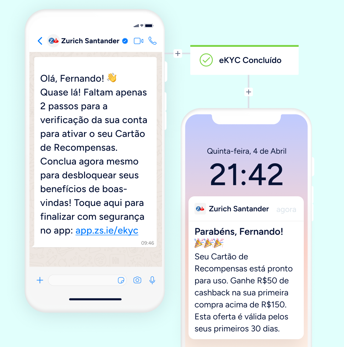 Recupere usuários que abandonam durante o processo de eKYC com lembretes oportunos via WhatsApp e push no app. Em seguida, conduza-os até a primeira transação para concluir o onboarding.
