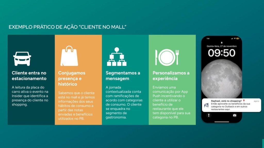 Esse setup já trouxe um “quadro interessante” de dados de cliente, mas faltava um elemento essencial: saber quando o cliente estava dentro do shopping para contextualizar as mensagens.