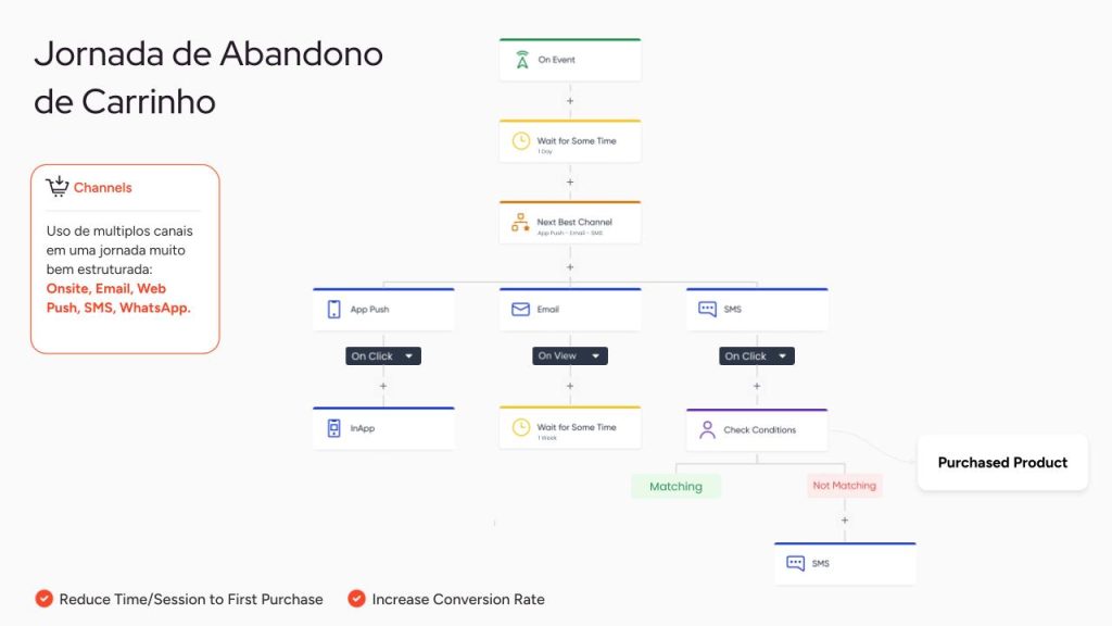 - Carrinho abandonado multicanal: uma jornada complexa, mas simples de operar, baseada no gatilho de abandono de carrinho em VTEX, com contadores de tempo definidos com o negócio, testes A/B e escolha dinâmica do melhor canal entre app push, onsite, WhatsApp e e-mail para cada consumidor.
