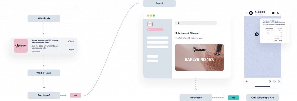 Por exemplo, você pode começar enviando notificações push da web para clientes que acabaram de navegar em seu site. Se isso não levar a uma conversão, você pode instruir o Insider One a aguardar algumas horas e enviar um e-mail promocional. Por fim, os clientes que convertem podem receber uma mensagem de confirmação no WhatsApp.