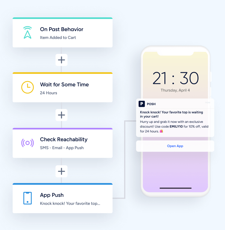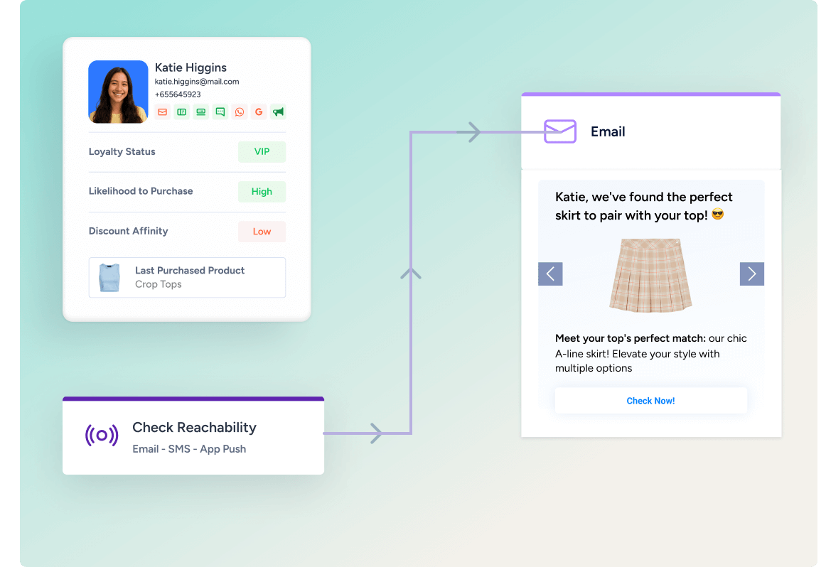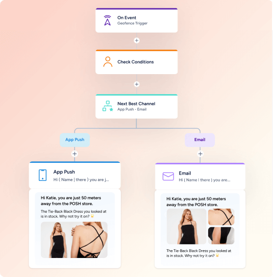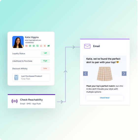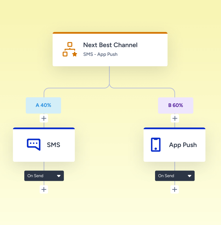 Use a plataforma de orquestração de jornada da Insider para enviar mensagens personalizadas em uma ampla gama de canais – e-mail, SMS, notificações push de aplicativos e muito mais. Garanta que cada ponto de contato com o cliente esteja alinhado com o estágio do ciclo de vida dele para que você tenha uma experiência consistente e impactante.