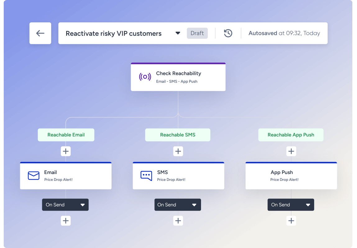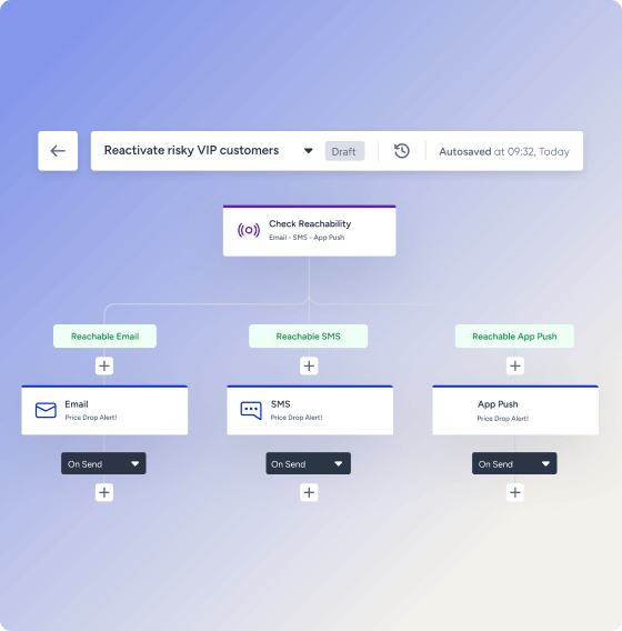 Utilize a análise preditiva para identificar os clientes que apresentam sinais de rotatividade. Acione automaticamente campanhas personalizadas de reconquista por meio de seus canais preferidos (por exemplo, e-mail, SMS ou notificações push), oferecendo incentivos ou lembretes personalizados para reengajá-los.