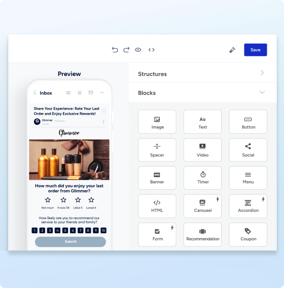 Crie e-mails de sucesso sem codificação. Com nosso editor de arrastar e soltar, você não precisa de atrasos técnicos ou filas de engenharia.
