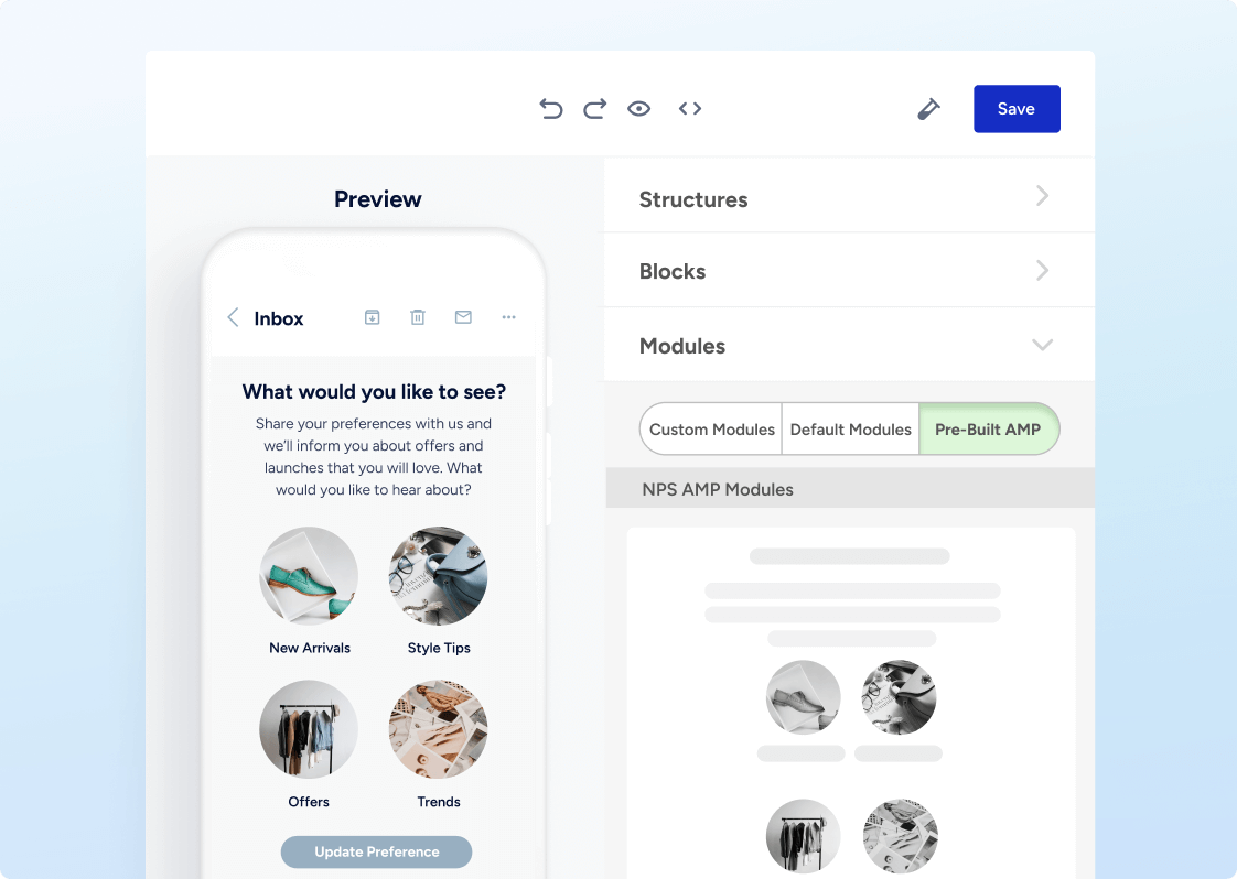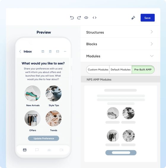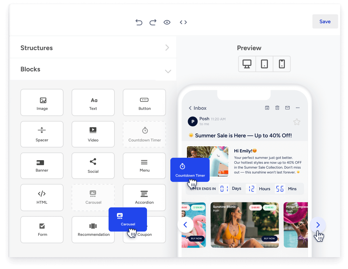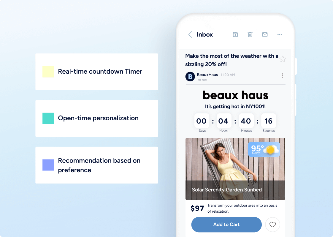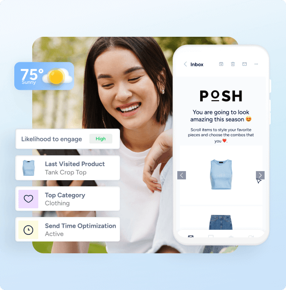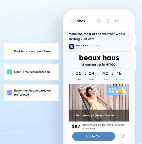 Transforme e-mails em experiências interativas. Adicione carrosséis de produtos ao vivo, formulários e conteúdo dinâmico para aumentar o envolvimento e gerar resultados – dentro da caixa de entrada.