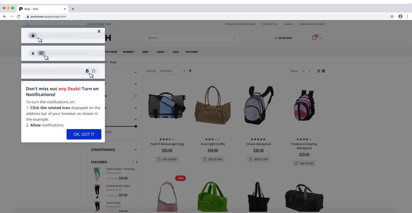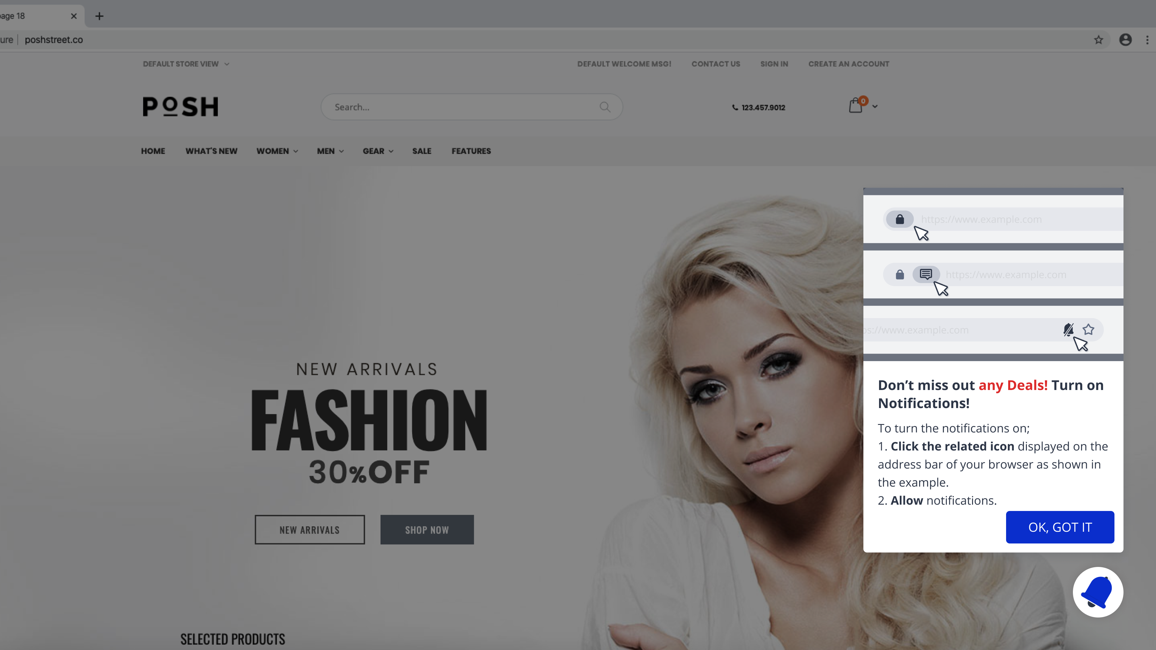 5. Two-step Opt-in Template: Chrome has always supported two-step opt-in prompts. It not only improves the users’ experience but also offers more context as to why users should allow notification permission. You can use a two-step opt-in template to nudge users to understand the context of seeking permission for sending notifications. Once the user allows, you can then trigger a pop-up that’ll guide the user to manually opt-in for notifications.