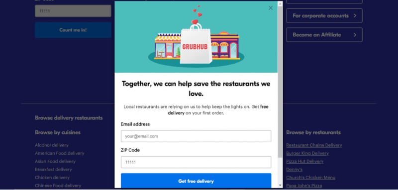 Empathize with your customers and seek help during these tough times.. Here’s an example of how GrubHub uses an overlay to show that we are in this together.