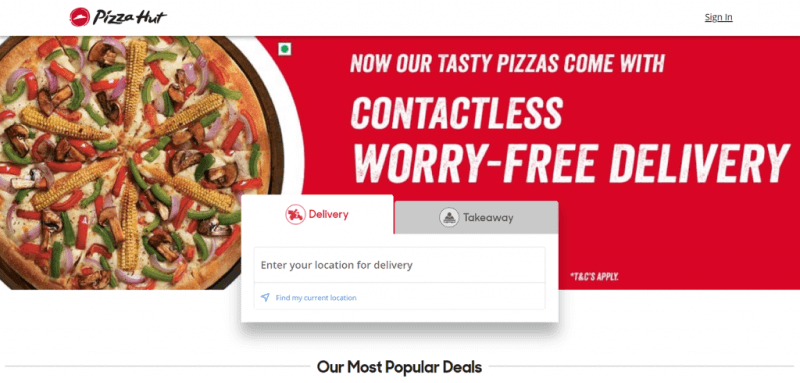 Use banners to communicate your safety standards and assure your users about how safe it is to order food or get products delivered from your business. Here’s an example of how Pizza Hut is using its home banner to ensure customers of the quality and safety of its restaurants.