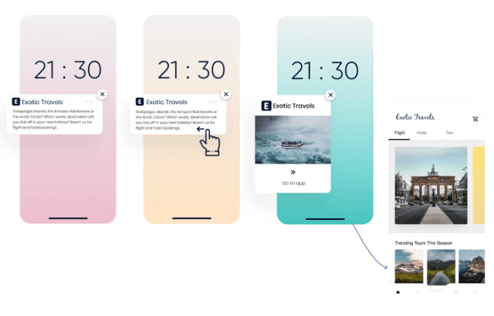 In keeping with this, the travel app sent a Carousel Push Notification to its LTP users, showcasing three exclusive travel destinations designed specifically for him. When the user opened the notification, he landed on a personalized, red-carpet version of the travel app, designed using Insider One’s Content Optimizer. The app listed all the information and tips he’d need to plan his holiday.