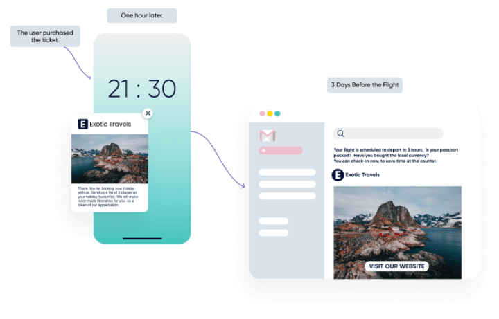 The engagement didn’t end here. If the customer purchased an air ticket, he would receive time-based push notifications leading to engage with him using different content. For example, this could be an email, reminding him to check when his passport was due for renewal and if he had packed his holiday essentials, along with a `Thank You’ note. This VIP treatment impacts a user’s brand perception and increases conversions for the company.