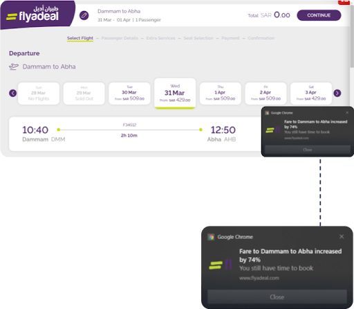 For flyadeal: Insider One’s growth team recommended using price-alert web push and ancillary push notifications. The price-alert push would notify users about the possibility of an increase in seat prices and encourage them to book their tickets now. Ancillary web push would upsell related add-on products/packages to users who had booked a flight. Insider One also recommended the use of homepage banners to tailor highly individualized website experiences based on each user’s past behaviors. Using real-time segmentation and AI-backed predictions, Insider One reimagined flyadeal’s onsite experience and provided the most relevant content to each user.