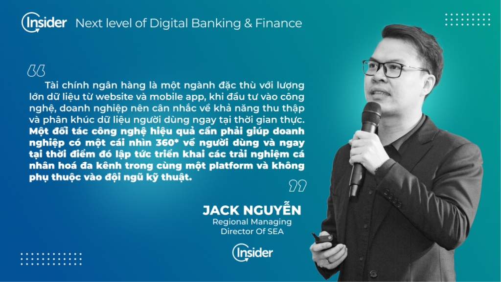 “Việc Số hoá ngành ngân hàng là điều tối quan trọng đối với các ngân hàng và tổ chức tài chính. Khi mà người dùng ngày càng đòi hỏi cao hơn về dịch vụ và cách họ trải nghiệm, tiếp xúc với các dịch vụ ngân hàng từ offline lên online. Do đó việc chuyển đổi ngân hàng thành một công ty công nghệ, cung cấp dịch vụ ngân hàng và cả phi ngân hàng nhanh chóng là một cơ hội bứt phá lên vị trí dẫn đầu nhằm đáp ứng xu thế về dịch vụ mọi lúc, mọi nơi, không rào cản, nhanh chóng của khách hàng và xã hội. Insider rất hân hạnh được đồng hành cùng với các ngân hàng hàng đầu Việt Nam như VPBank, MBBank, Techcombank… trong quá trình Số hoá ngành ngân hàng” – anh Jack Nguyễn – Regional Managing Director of SEA Insider chia sẻ.