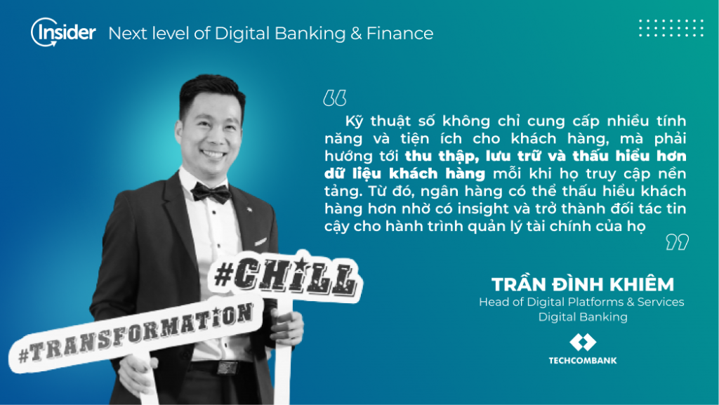 “Kỹ thuật số không chỉ cung cấp nhiều tính năng và tiện ích cho khách hàng, mà phải hướng tới thu thập, lưu trữ và thấu hiểu hơn dữ liệu khách hàng mỗi khi họ truy cập nền tảng. Từ đó, ngân hàng có thể thấu hiểu khách hàng hơn nhờ có insight và trở thành đối tác tin cậy cho hành trình quản lý tài chính của họ” anh Trần Đình Khiêm – Head of Digital Platforms & Services Digital Banking Techcombank chia sẻ.