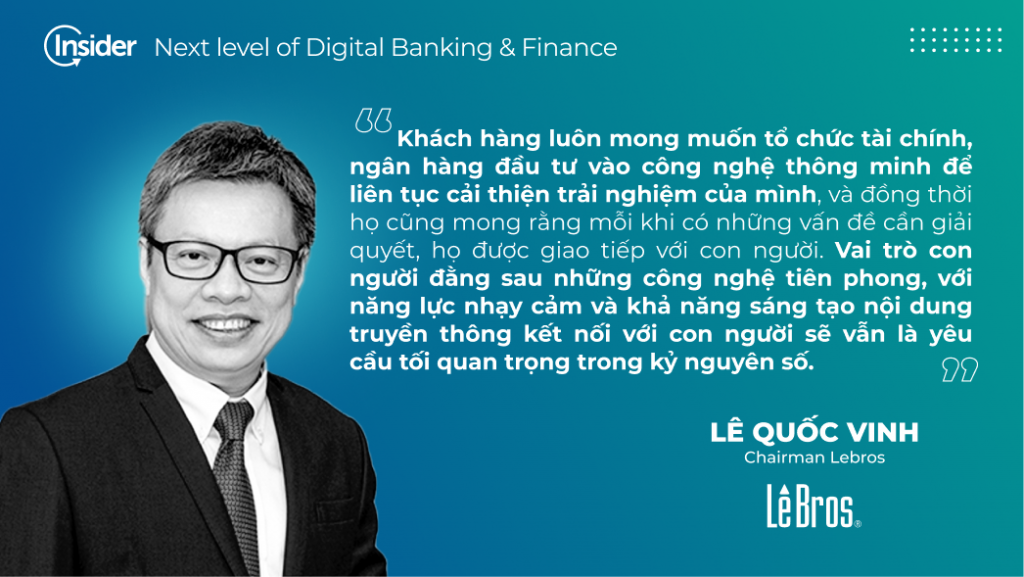“Khách hàng luôn mong muốn tổ chức tài chính, ngân hàng đầu tư vào công nghệ thông minh để liên tục cải thiện trải nghiệm của mình, và đồng thời họ cũng mong rằng mỗi khi có những vấn đề cần giải quyết, họ được giao tiếp với con người. Họ tin rằng, chỉ có con người mới đủ khả năng thấu hiểu những băn khoăn, nhu cầu mang tính hết sức cá nhân, cũng như đối xử với họ với tư cách là những con người cụ thể, với những đặc tính không hoàn toàn giống những người khác. Cho đến khi công nghệ có thể giả lập hoàn toàn trí tuệ của con người, mà điều đó sẽ còn là viễn cảnh xa, thì vai trò của con người đằng sau những công nghệ tiên phong, với năng lực nhạy cảm và khả năng sáng tạo nội dung truyền thông kết nối với con người sẽ vẫn là yêu cầu tối quan trọng trong kỷ nguyên số” – Chia sẻ từ ông Lê Quốc Vinh – Chairman LeBros