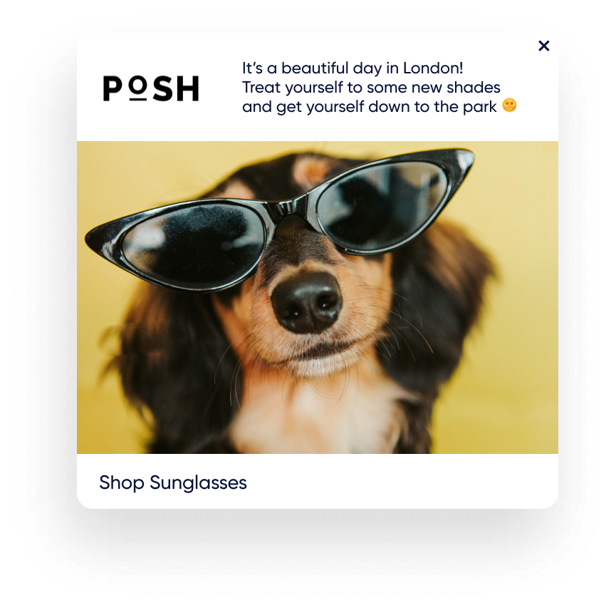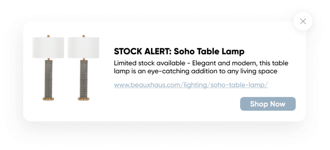 Deliver timely, relevant and personalized rich push notifications when a product comes back in stock or there is a price drop, to drive customers on-site to buy or recover their cart.