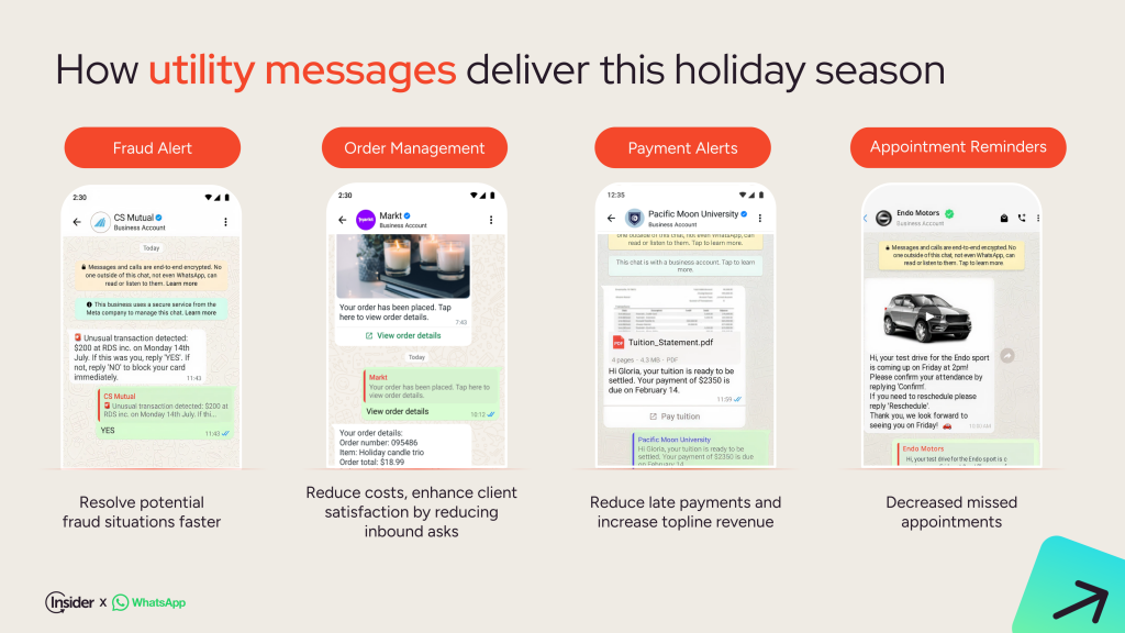 - Utility messages that reassure: Provide order confirmations, payment alerts, and delivery updates directly in apps. Each message eliminates uncertainty and builds trust. Utility messages are especially important during the busy holiday season, helping to reduce inbound service requests during a high-volume period.